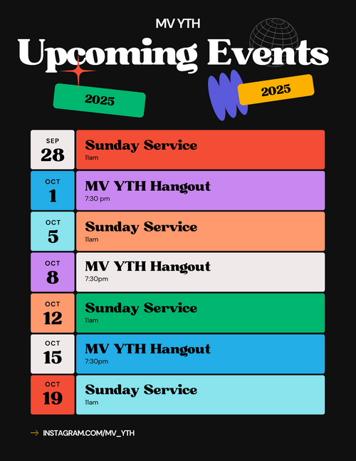 Hey MV Youth! Dive into our Wednesday Hangouts—kick off at 7:30 PM! Students connect, chill, and straight-up encounter God through real-talk small groups. It's your spot to vibe, grow, and level up your faith game.